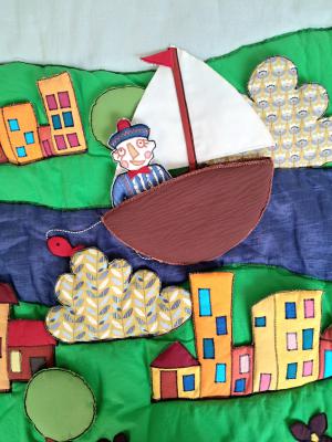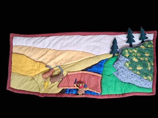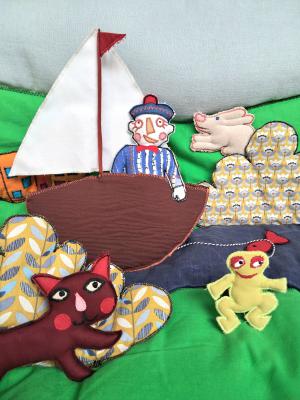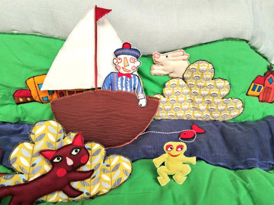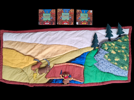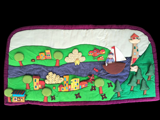 Imaginez, un grand tapis en tissu illustrant un décor d’après un album jeunesse. Le tapis est conçu en volume et s’accompagne d’accessoires et de personnages en tissus rembourrés.