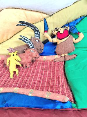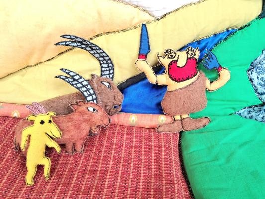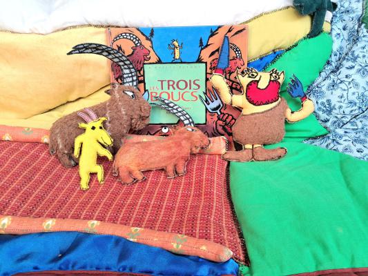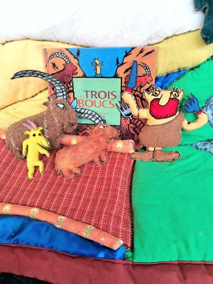 Une mise en scène de l'album de Jean-Louis Craver, illustré par Rémi Saillard (Didier Jeunesse, 2010 - A pas petons) qui peut être raconté en français et en breton. L'herbe est si haute, si appétissante que Poilu, Velu et Barbu, les trois boucs décident de la goûter. Mais, pour y arriver, il faut franchir un pont sous lequel habite un horrible troll...